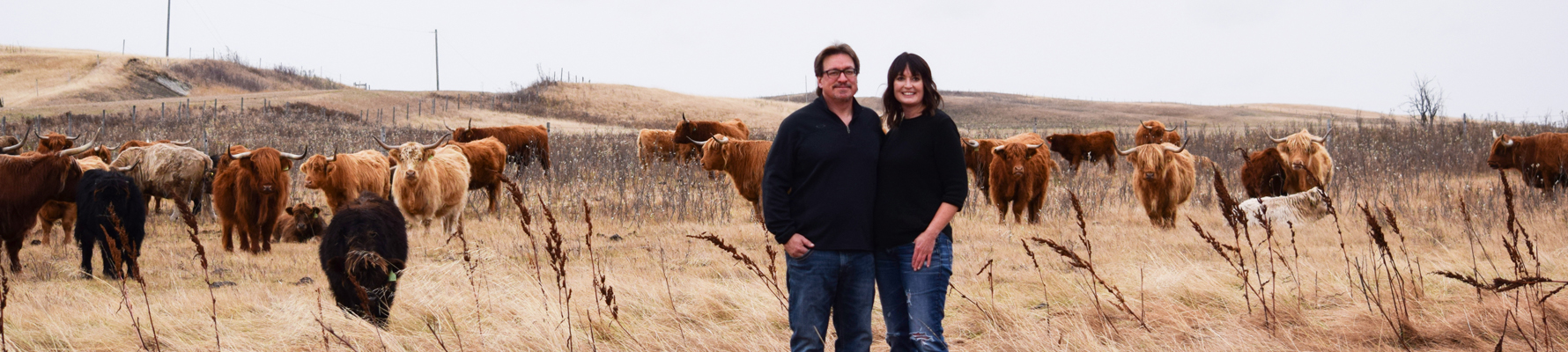We raise registered Highland cattle in the heart of east-central Alberta. We initially chose Highland cattle because we wanted a breed that was easy to handle, was low maintenance and finished well on grass. And to be honest, aesthetics and personality played major roles in our choice. Stocky, rugged with the shaggy coat, signature dossan and sweeping horns - there's no mistaking a Highland.